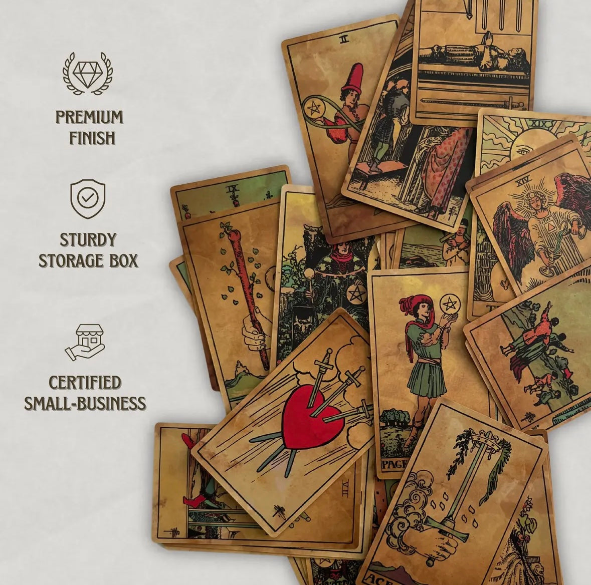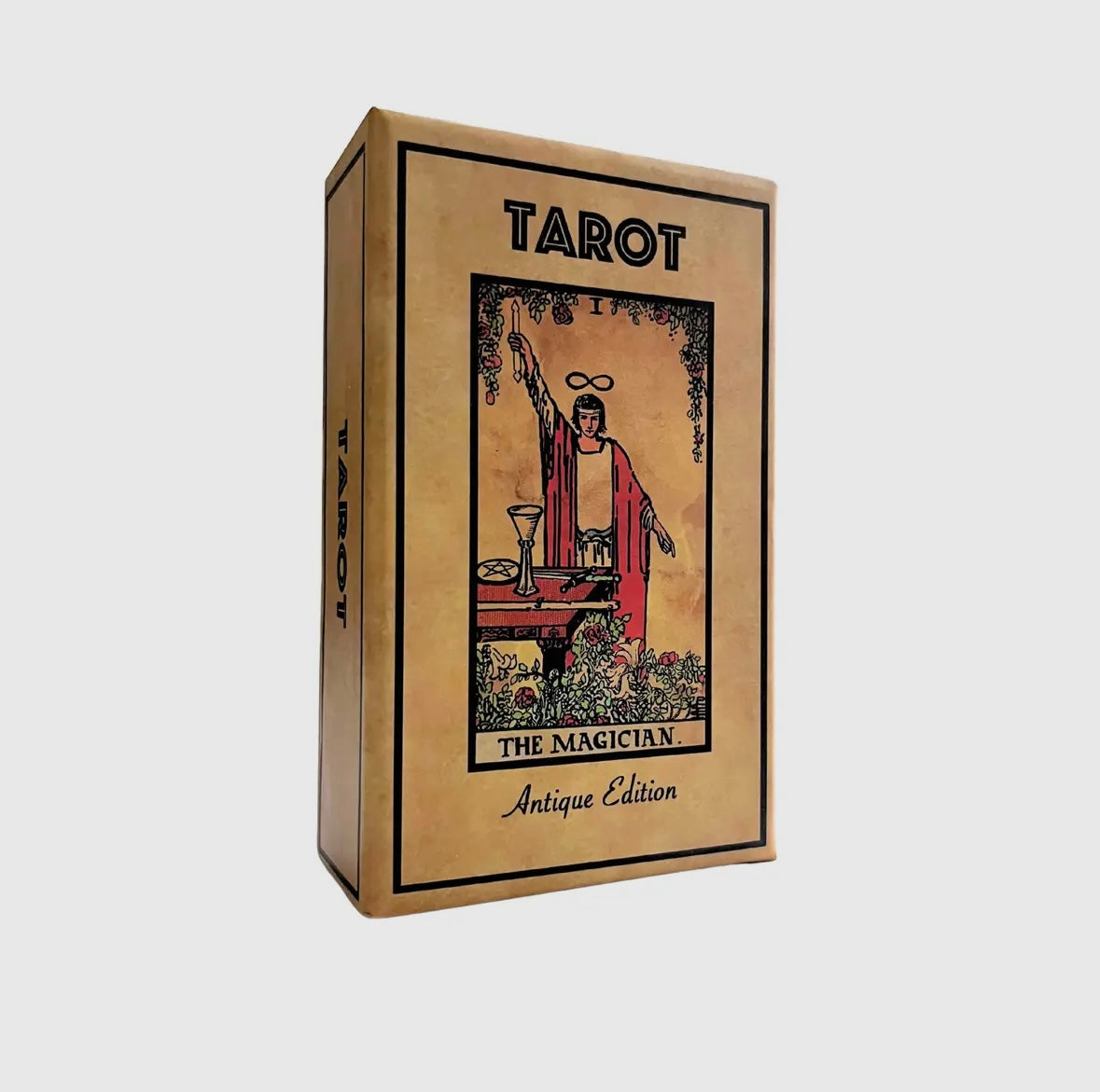 Antique Edition Tarot, una refinada reinvención de la clásica baraja Rider-Waite, cuidadosamente recoloreada en una cálida paleta antigua. Perfecta para lectores de todos los niveles, esta baraja equilibra el encanto histórico con tonos suaves y envejecidos para una experiencia verdaderamente nostálgica pero utilizable.