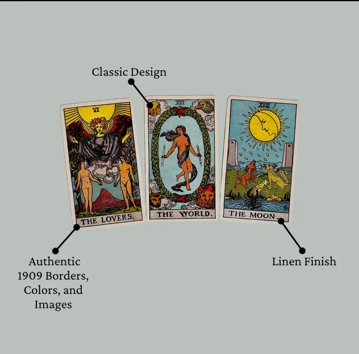 Cada carta de esta baraja atemporal es una obra de arte, recreada meticulosamente para capturar la esencia de la baraja original de Tarot Rider-Waite de 1909 con ilustraciones de Pamela Colman. Las intrincadas ilustraciones, el rico simbolismo y los colores vibrantes evocan una sensación de asombro y misterio, e invitan a embarcarse en un viaje de autodescubrimiento e introspección.