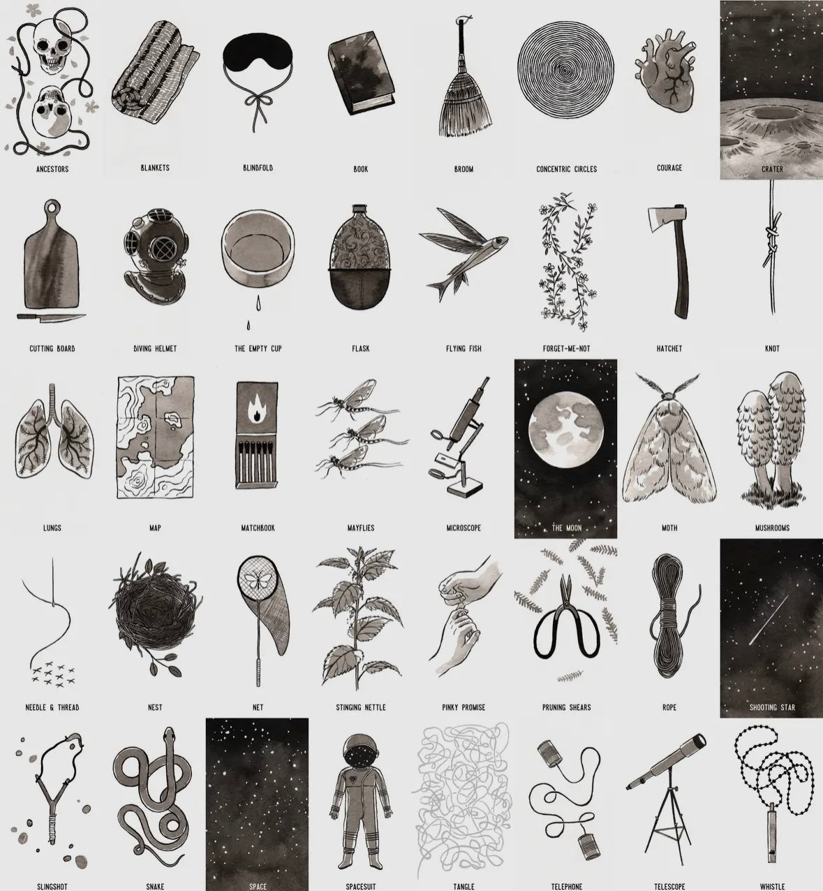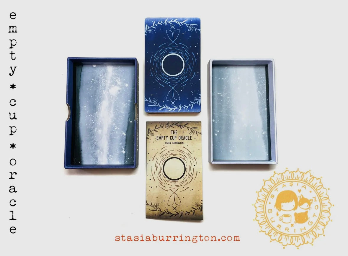 The Empty Cup Oracle es una colección original de 40 cartas, símbolos personalesde Stasia Burrington renderizados con cariño en tinta negra minimalista.