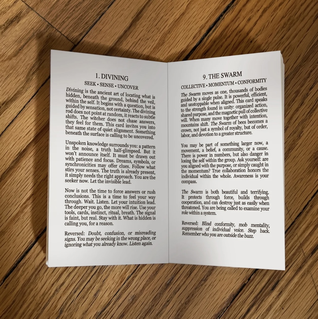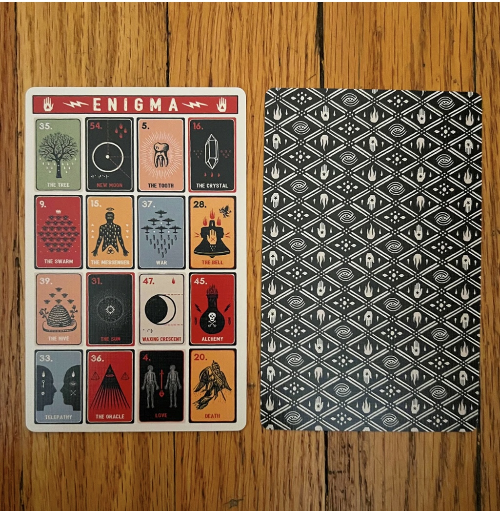 Más que un oráculo, ENIGMA es también un minijuego, inspirado en clásicos como Bingo y Lotería. Esta capa lúdica pero ritualista añade una dimensión única, donde la estructura se encuentra con el simbolismo. Puedes usar la baraja como mejor se adapte a tu vida: como un juego, una herramienta para la visión, un espejo para la reflexión o un compañero en tu viaje. Su diseño flexible se mueve contigo, ya sea en soledad o en exploración compartida.