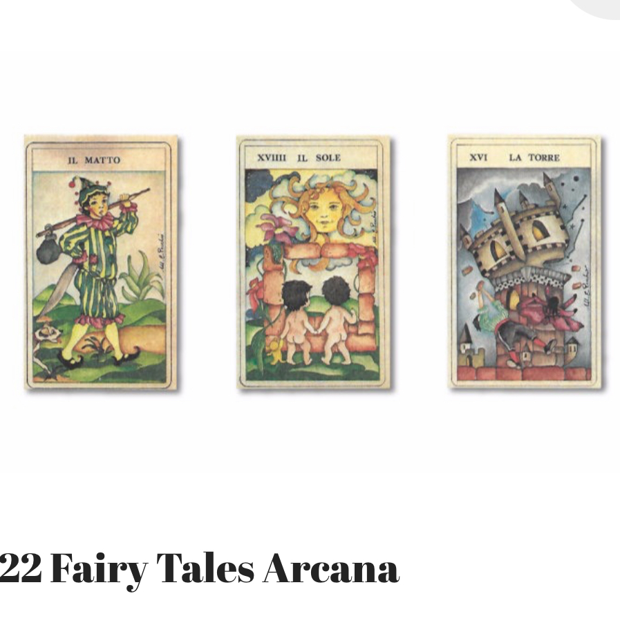 Una baraja en el diseño de 22 Arcanas Mayores de Maria Elena Pecchio en los años 80 con un punto de vista de cuento de hadas.