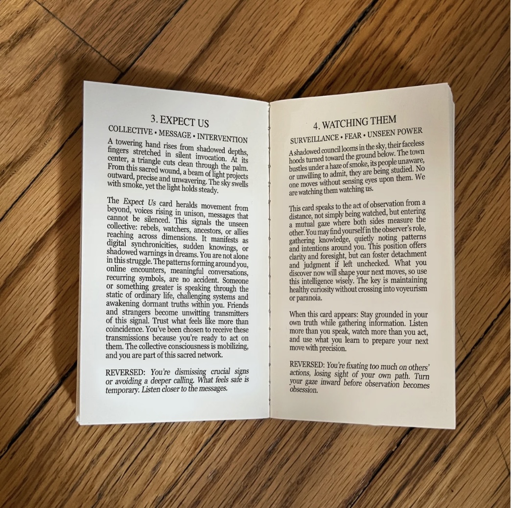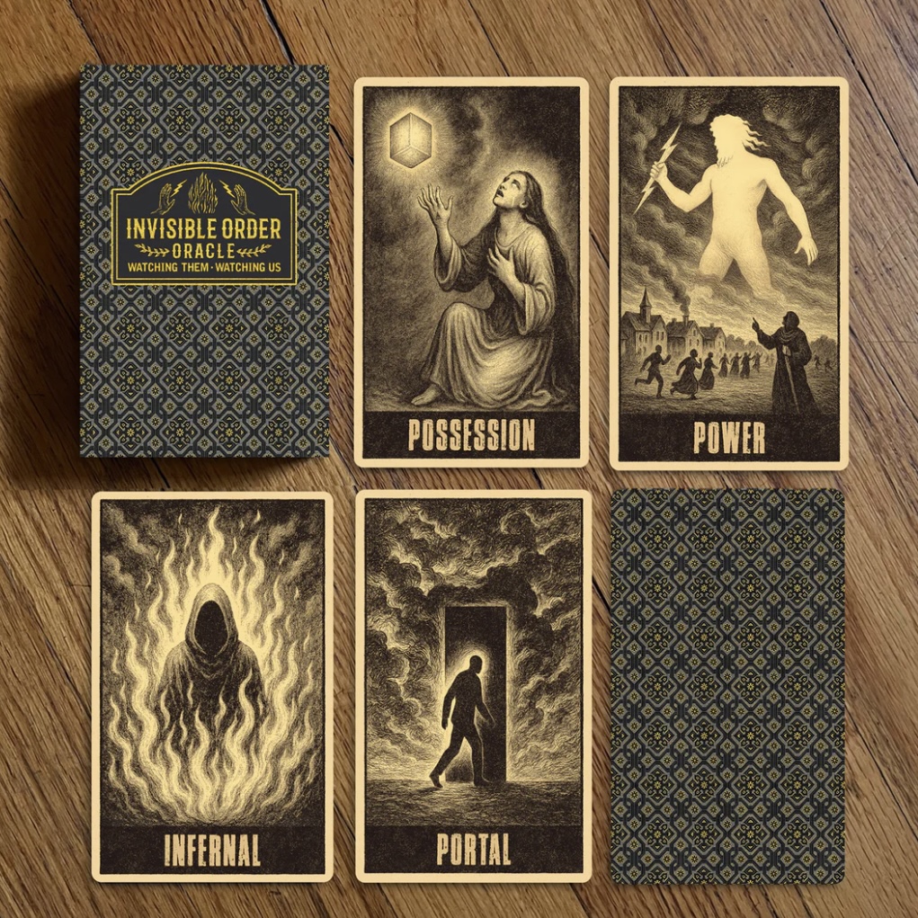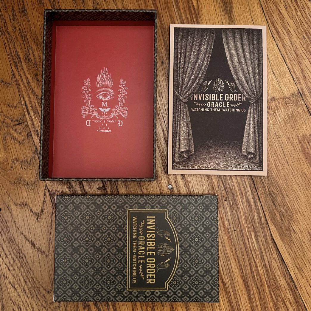 El Oráculo de la Orden Invisible viene de un lugar muy diferente al de mis otras barajas. Explora temas que la sociedad a menudo empuja hacia las sombras, los tabúes y se mueve hacia un terreno más oscuro, tocando temas de control, vigilancia y las fuerzas ocultas que nos influyen. Te invita a ver estas fuerzas con claridad y a reclamar tu propia conciencia.
