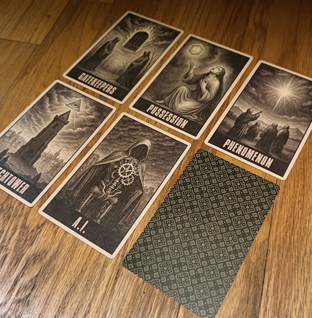 Mientras que Earth Magick es cálido, humano y orgánico, The Invisible Order lleva un tono más frío y distópico, que refleja las sutiles manipulaciones de nuestra era tecnológica. Debido a que esta cubierta trata de la IA y el posthumanismo en el mundo distópico en el que vivimos, parecía apropiado usar la IA en sí como parte del proceso, ya que la IA está entretejida en la adivinación misma de la baraja. Por esta razón, elegí experimentar con una herramienta controvertida: la IA. Entrenado en mis propios bocetos, dibujos y estética, luego pasé incontables horas refinando las imágenes a mano, trabajando digitalmente en caras y manos, agregando símbolos, superponiendo detalles místicos, eliminando lo que no pertenecía y dando forma a todo para llevar mi voz y simbolismo. Cada imagen fue serigrafiada para darle la calidad táctil, envejecida y terrenal presente en todo mi arte.