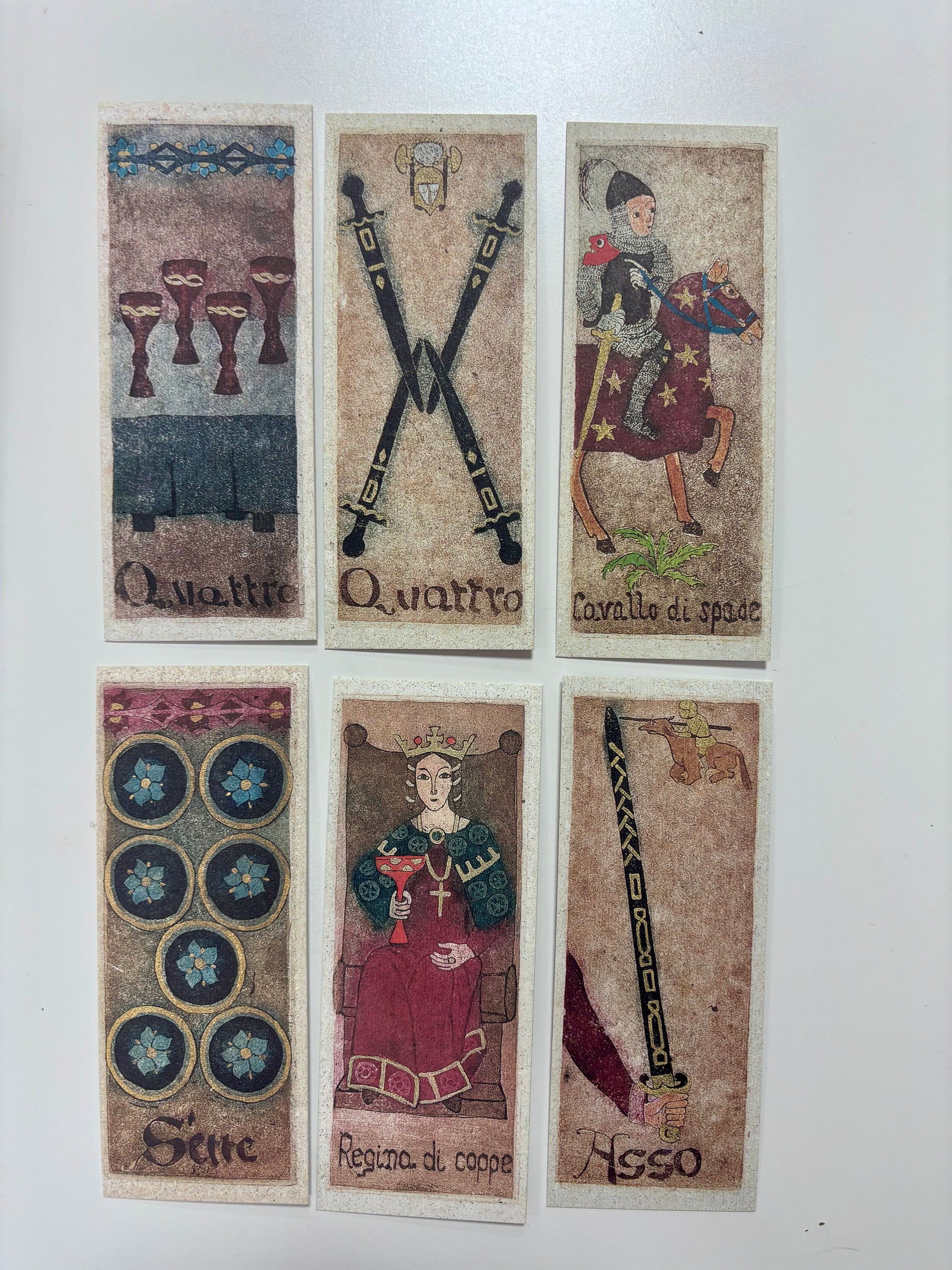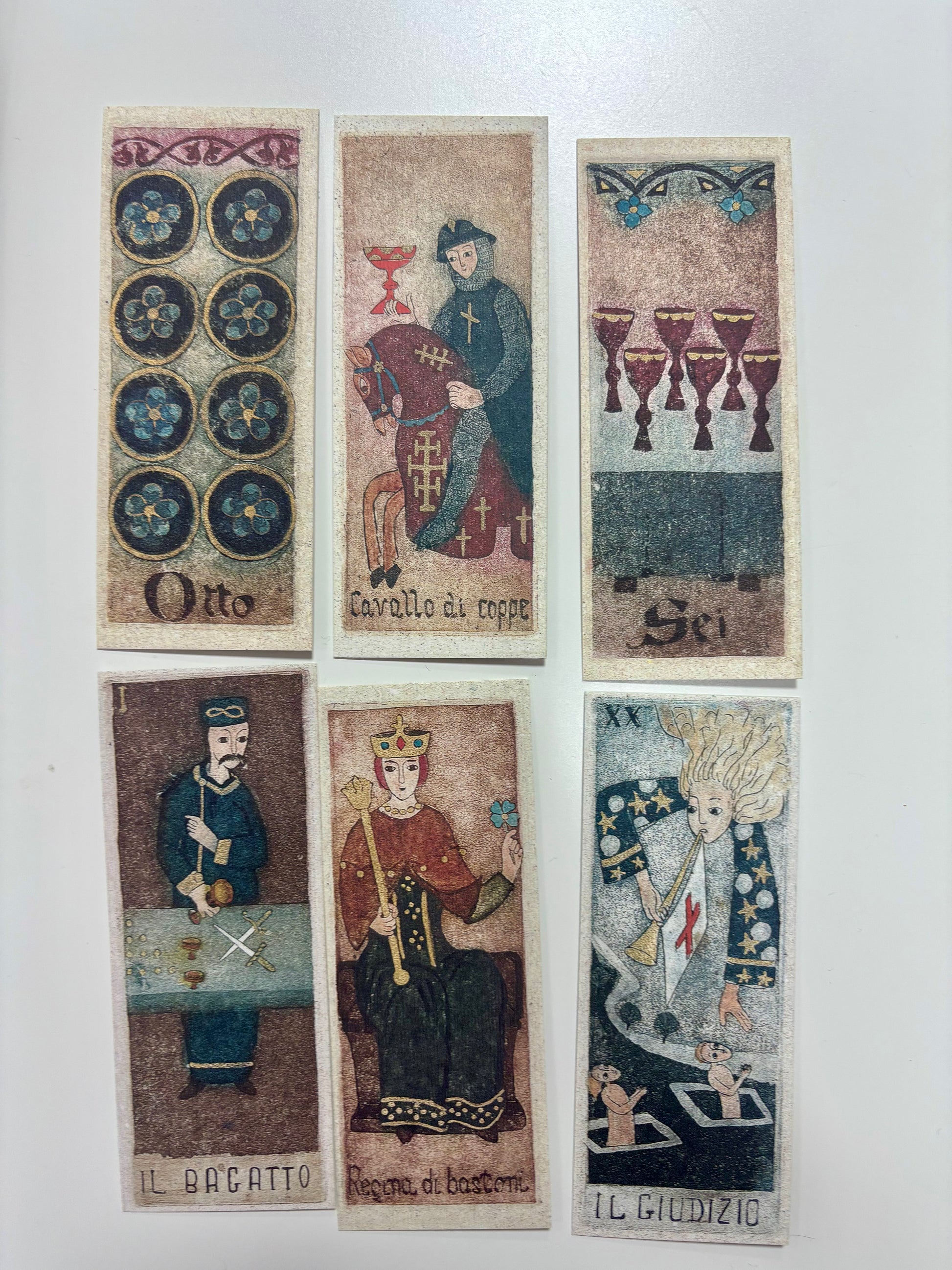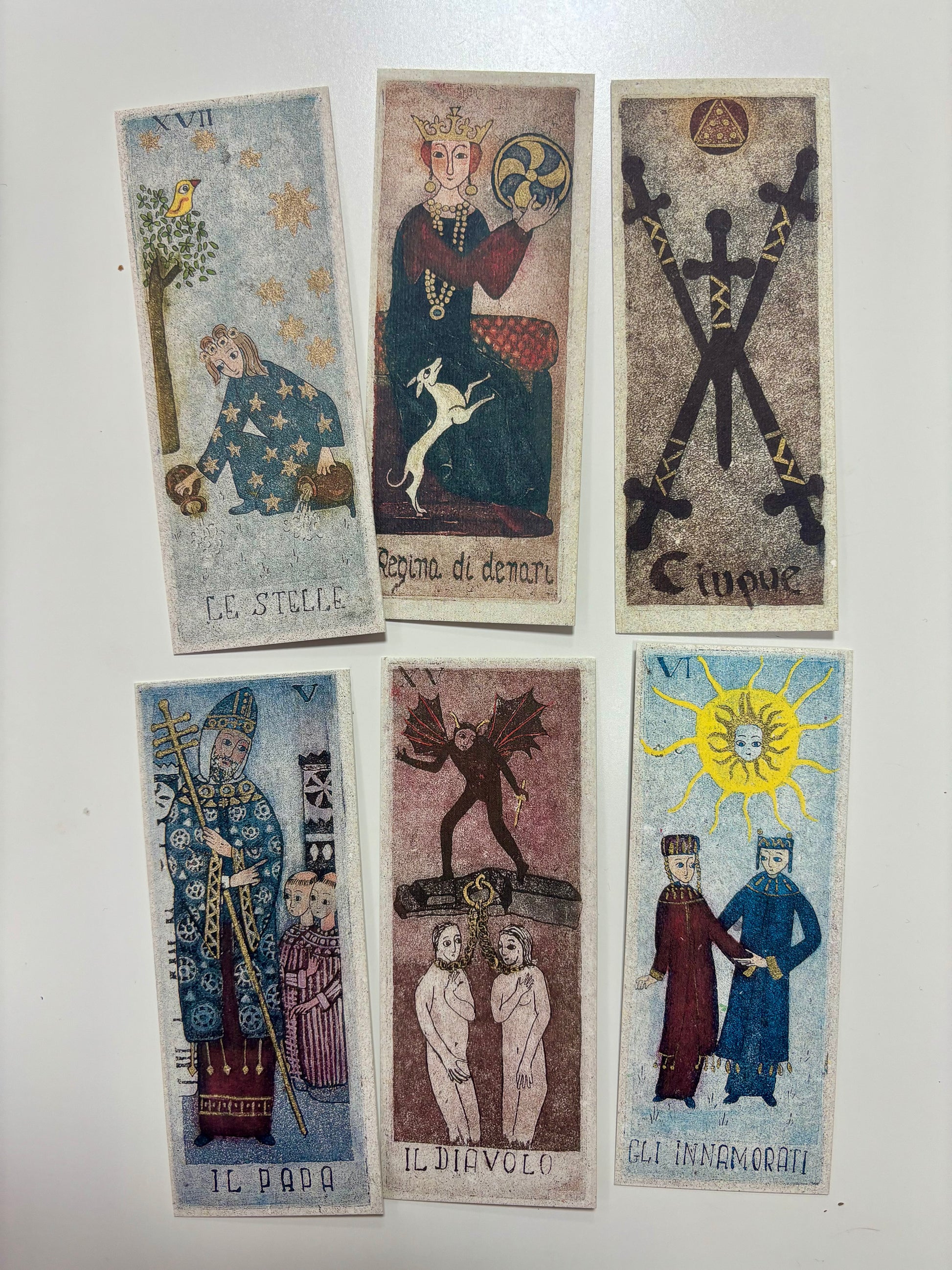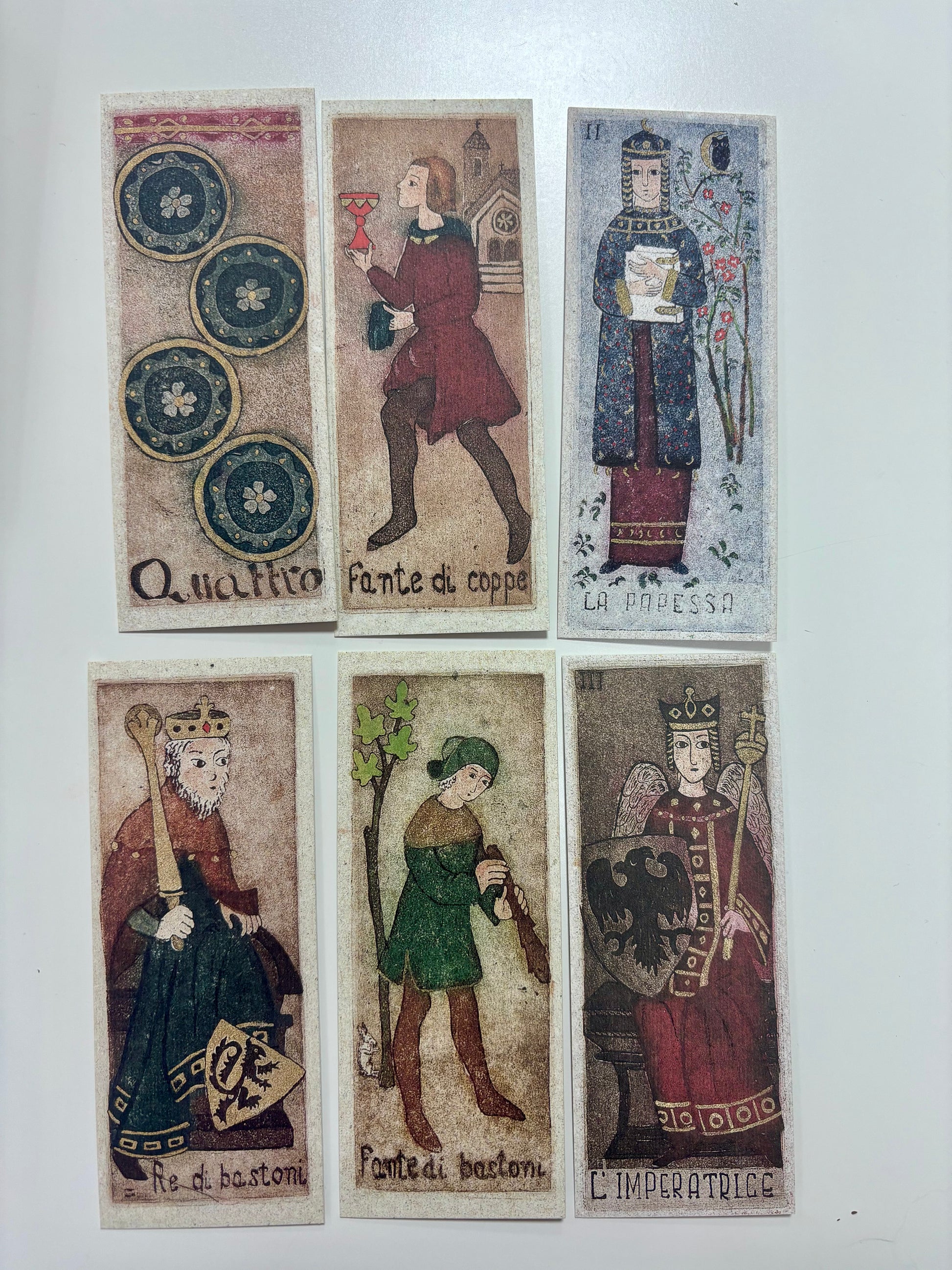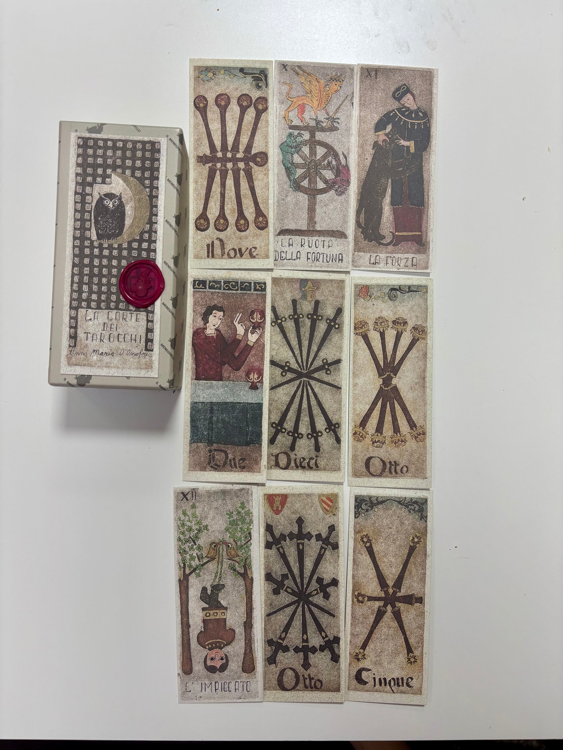 Esta preciosidad de baraja es de Anna Maria D’Onofrio, quien la diseñó en 1999 con un enfoque medieval, conservando una simbología clásica. 78 cartas. 2000 ejemplares numerados.