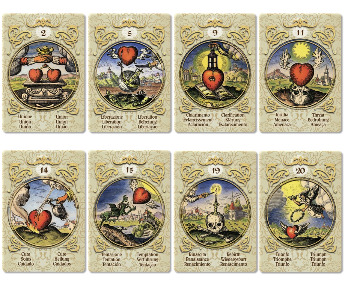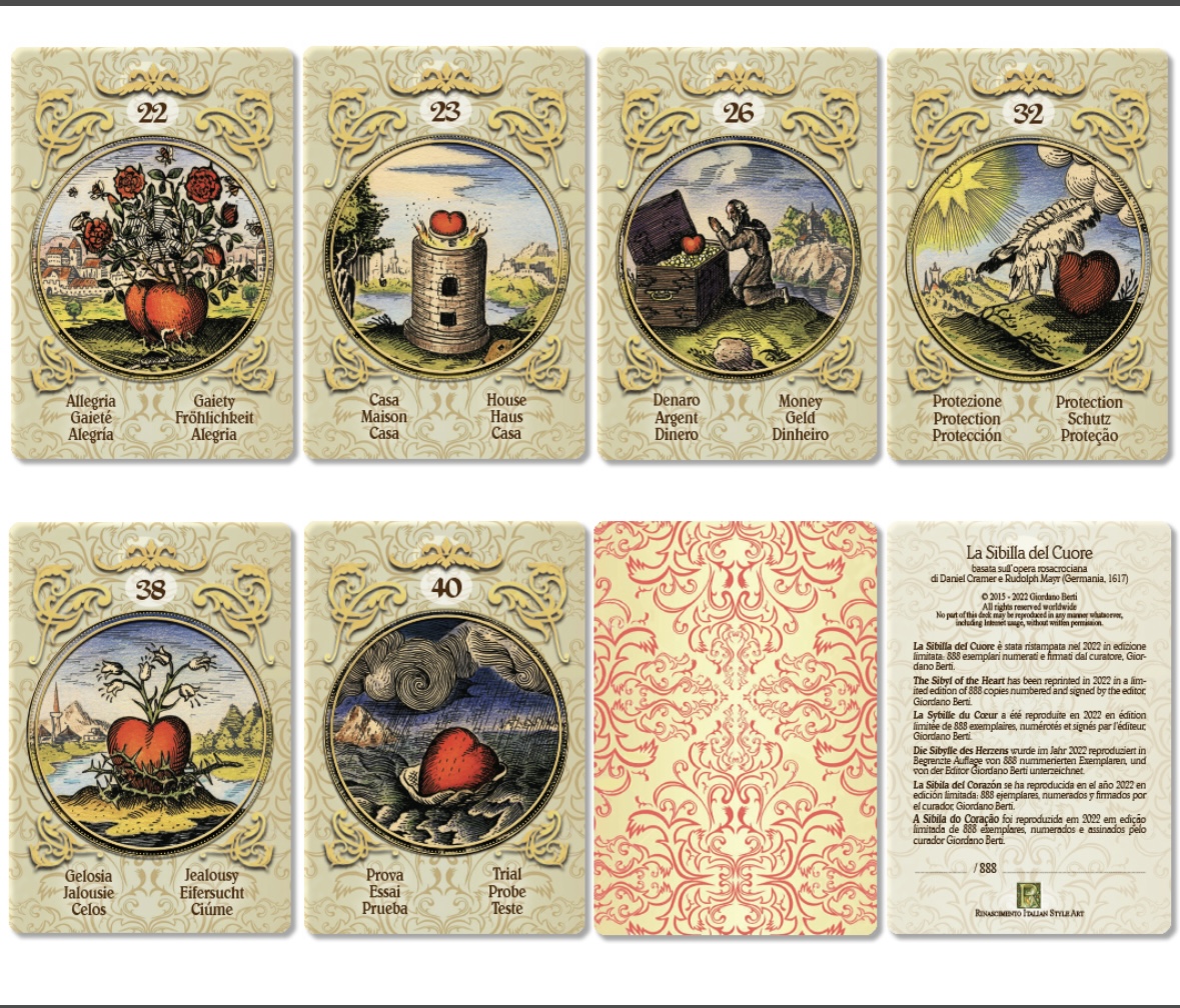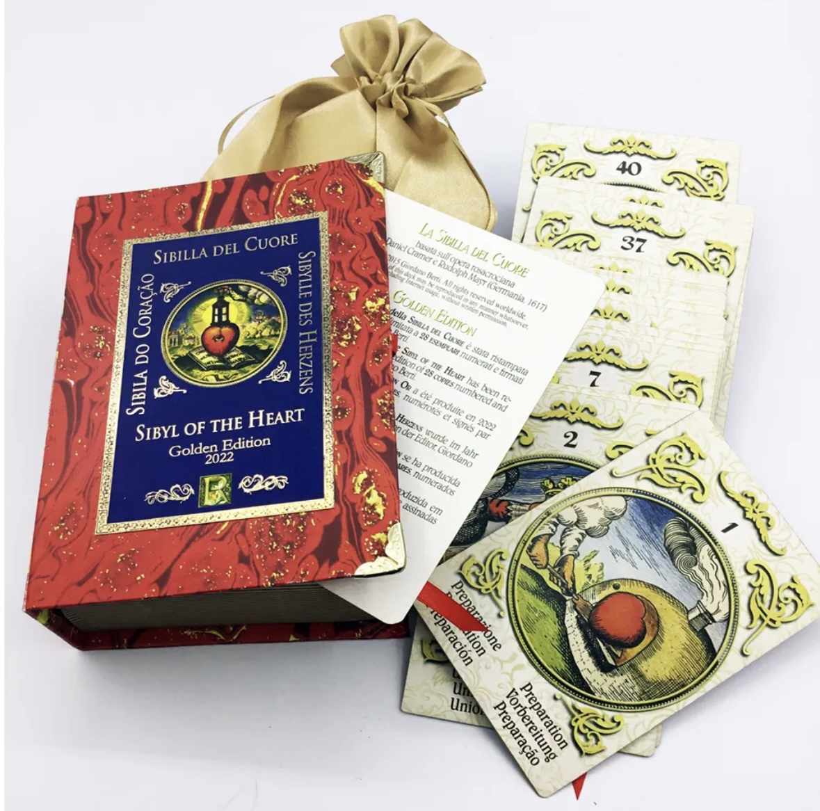 La Sibila del Corazón es una maravillosa herramienta útil para investigar sobre uno mismo y los sentimientos de otras personas. Las ilustraciones de este espléndido mazo provienen de la obra de un Maestro Rosacruz impresa en 1617. El hilo conductor es el corazón, considerado como la sede de las emociones humanas y símbolo de estados de ánimo que involucran a todas las personas a lo largo de su existencia.