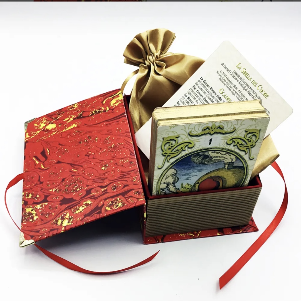 Se puede tener en esta hermosa CAJA DELUXE (en forma de libro) con reflejos dorados diseñada por la diseñadora Letizia Rivetti y producida a mano por expertos artesanos italianos. Papel jaspeado. Esquinas de metal dorado. Interior de terciopelo rojo. Cierre con cordón de satén. ¡NO HAY PLÁSTICO!