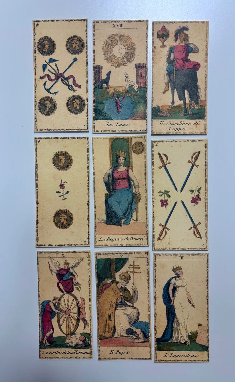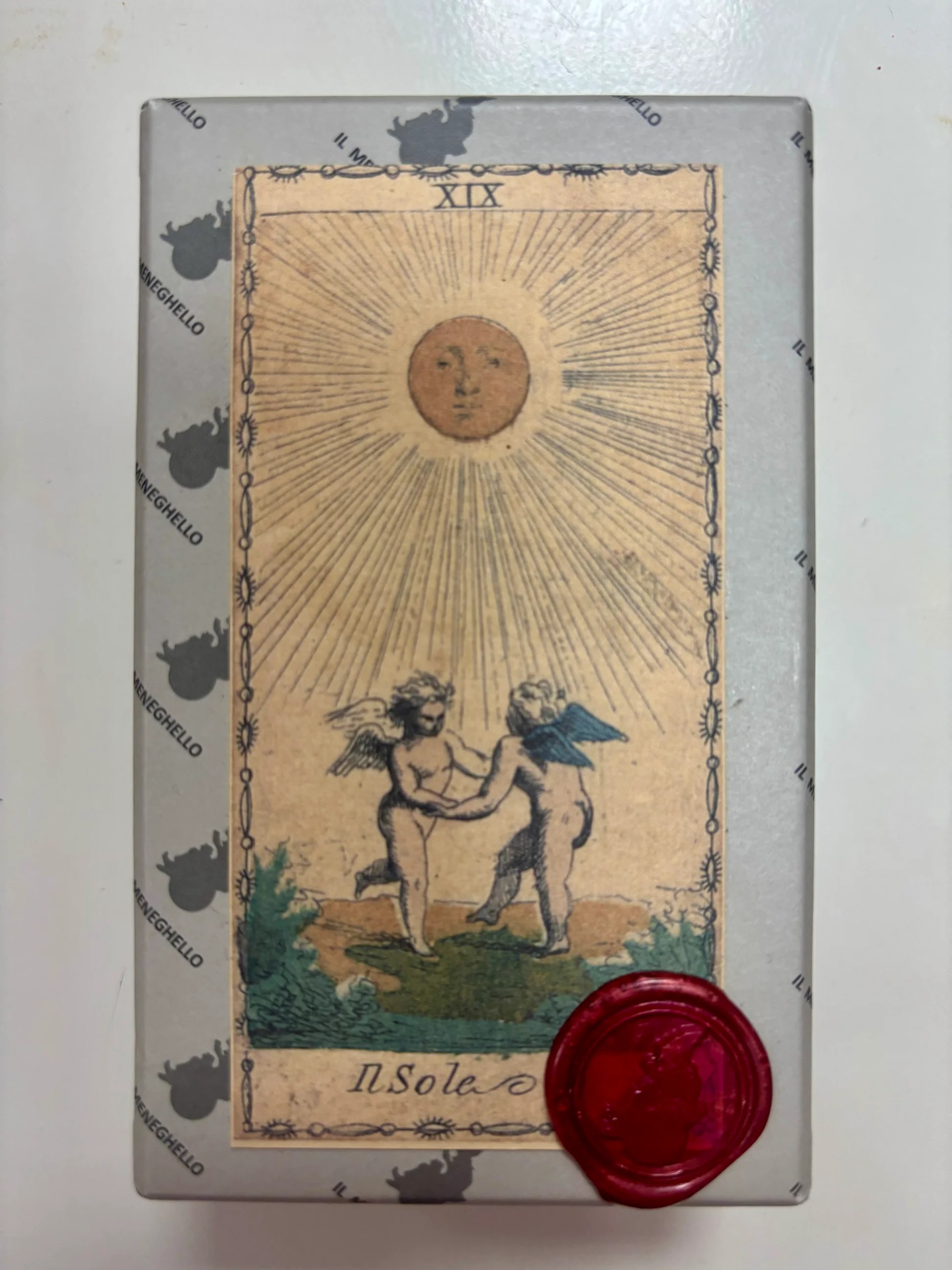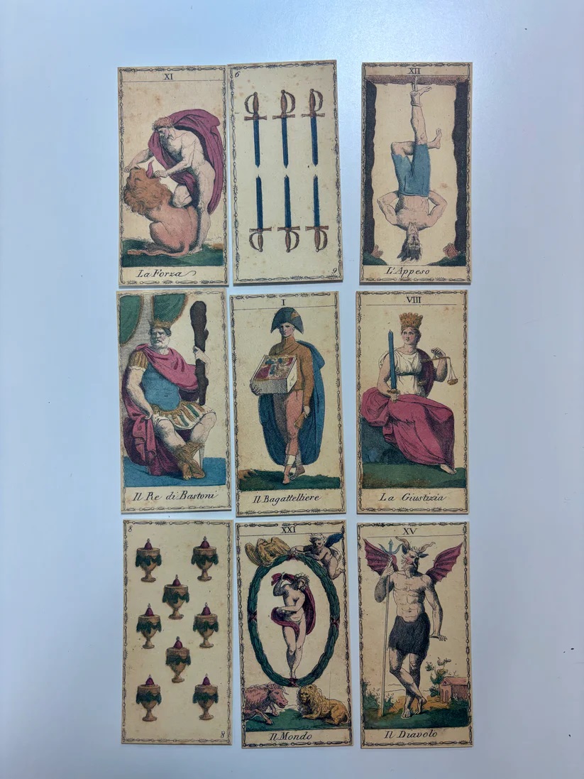Esta joya de Il Meneghello es la segunda edición de este mazo creado por Ferdinando Gummpenberg en Milán en 1810. Un elegante mazo de 78 cartas que refleja la época.