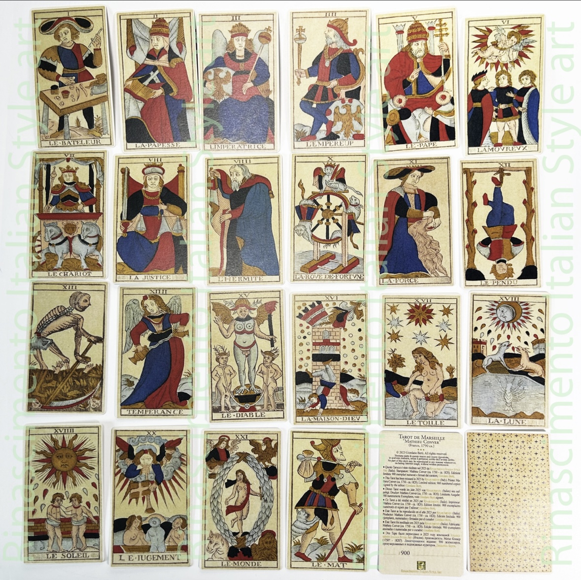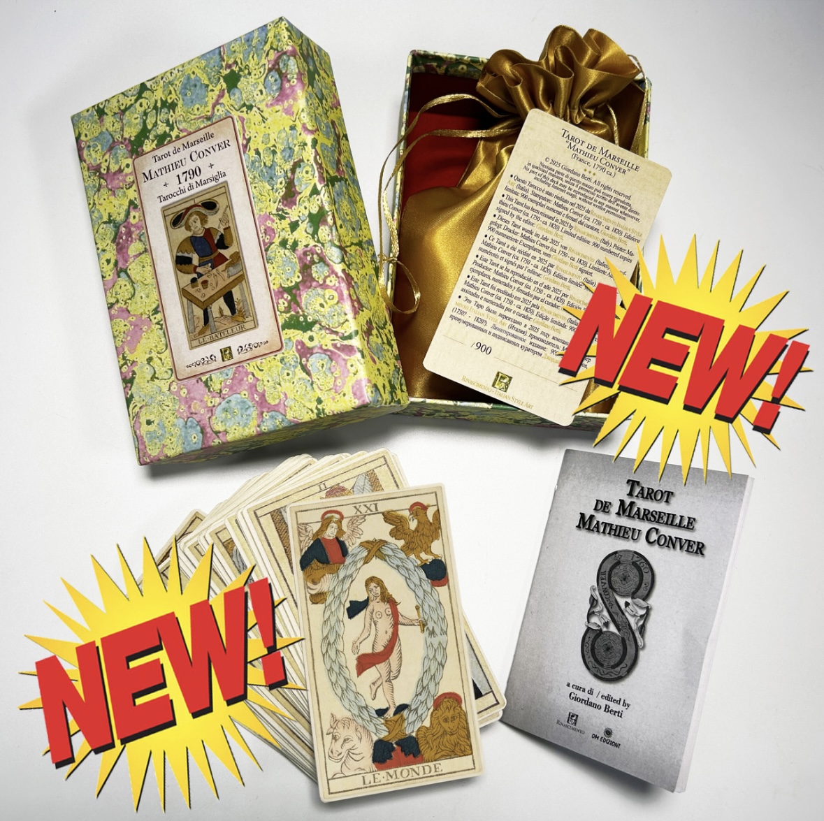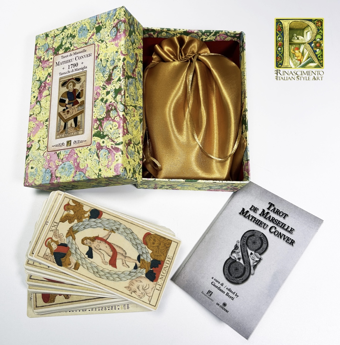 En el 2 de Oros se lee 'N.as Conver 1760', pero esta firma se refiere probablemente a Nicolas Sylvestre Marie Conver, hijo de Mathieu, activo desde aproximadamente 1810 hasta 1833. Cada tarólogo debe poseer esta espléndida versión, absolutamente fiel al original. El ART BOX contiene 78 TARJETAS, un LIBRETO BILINGÜE (37 páginas, en italiano e inglés) con noticias históricas a cargo de Giordano Berti y Alfredo Mazzara, además de un PLIEGUE con instrucciones cartómánticas sintéticas.