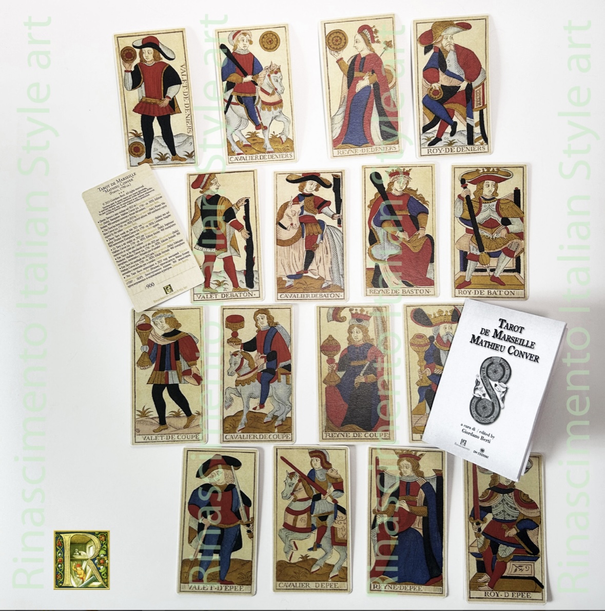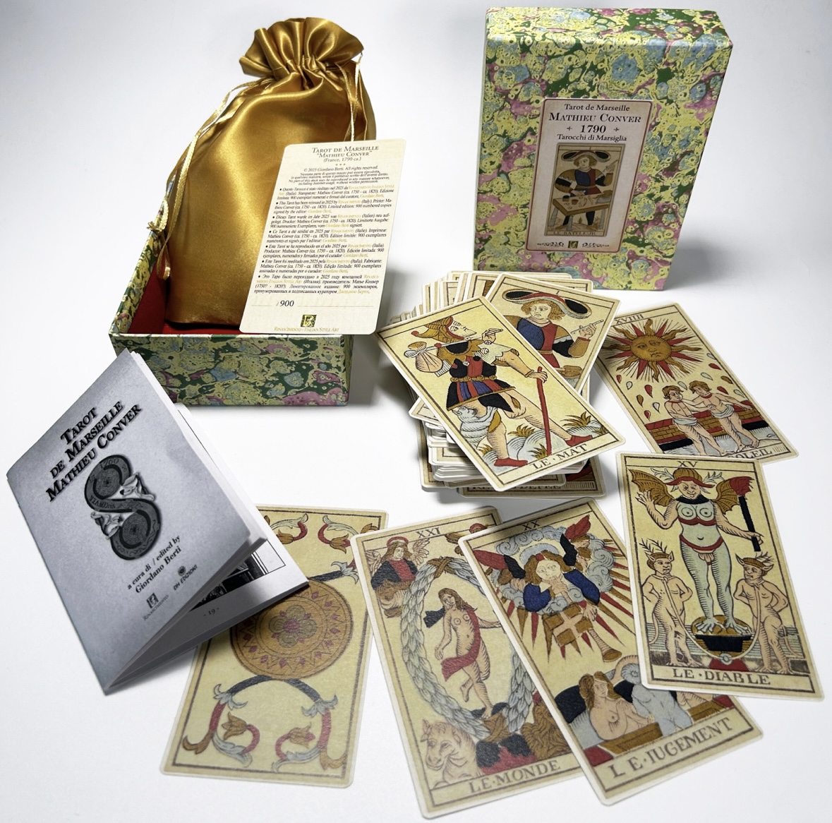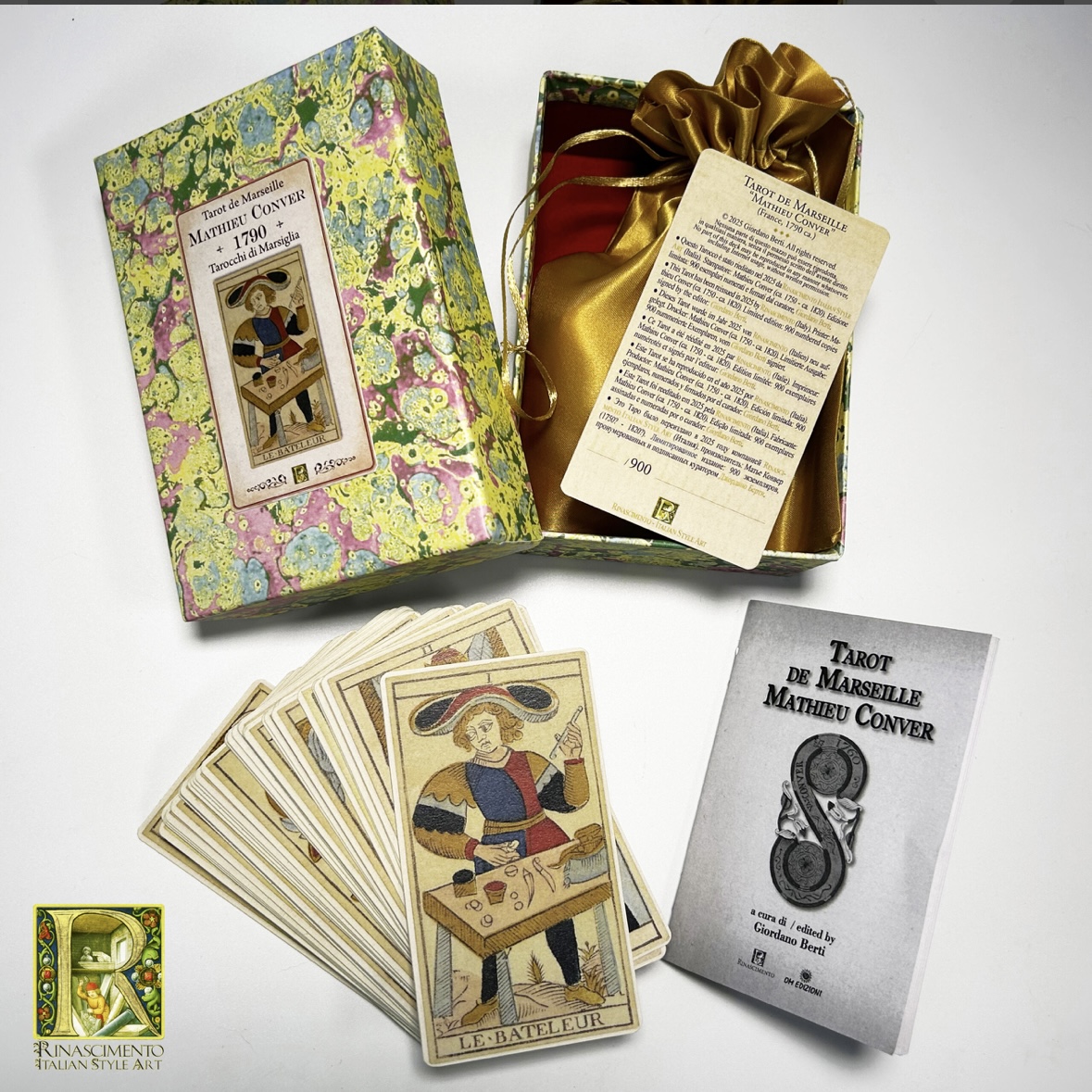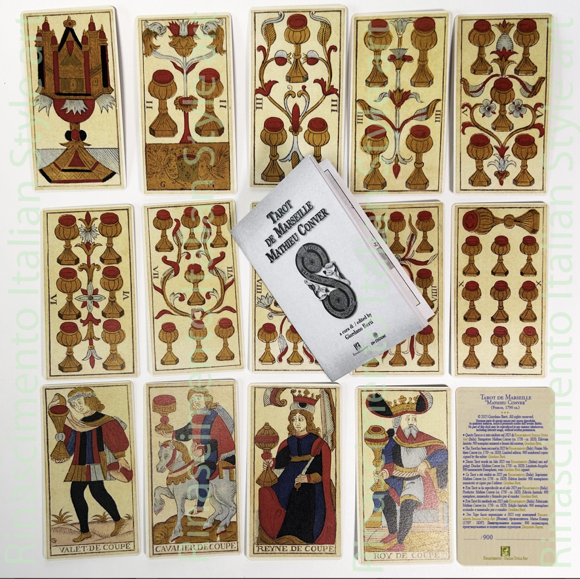 A partir de matrices de madera producidas por un fabricante de Marsella, alrededor de 1790 Mathieu Conver imprimió este Tarot. La baraja de Mathieu, encontrada recientemente, es la versión más antigua del famoso ANCIEN TAROT DE MARSEILLE CONVER.