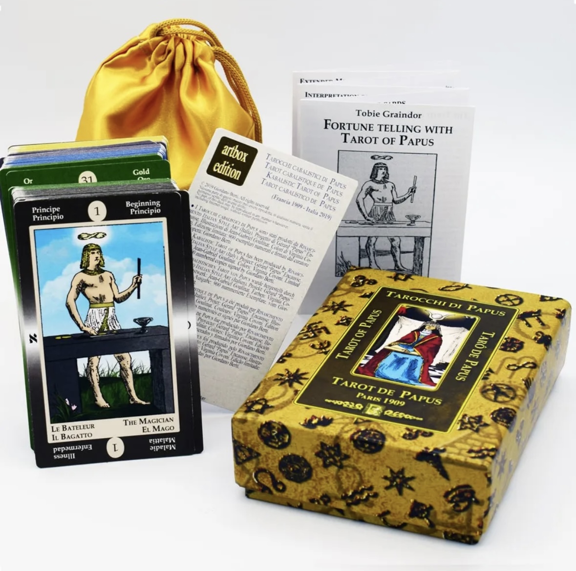 Papus, alias Gérard Encausse, fue un gran Maestro del Ocultismo moderno, Autor de decenas y decenas de obras sobre todos los temas esotéricos, incluido el Tarot. Su ensayo “Le Tarot divinatoire”, publicado en 1909, fue enriquecido por 78 Arcanos en blanco y negro. Rinascimento Italian Style Art ha querido volver a publicar el ramo de colores confiando su cuidado a Giordano Berti, conocido en todo el mundo por sus estudios sobre el esoterismo del Tarot. La elección de los colores deriva, obviamente, del simbolismo en uso en la Orden Cabalística de la Rosa Cruz, a la que Papus estaba vinculado. La versión ART BOX consta de 78 TARJETAS de grandes dimensiones (82 × 152 mm), insertadas en una elegante CAJA diseñada por la diseñadora Letizia Rivetti y producida a mano por expertos artesanos italianos. ¡NO HAY PLÁSTICO! Se trata de una EDICIÓN LIMITADA de solo 900 COPIAS numeradas y autografiadas por Giordano Berti en un CERTIFICADO DE GARANTÍA. El ataúd, además de los 78 papeles, contiene un PLIEGUE de 12 páginas con los significados cartománticos y las modalidades de interpretación sugeridas por Papus. Una DEDICATORIA PERSONAL escrita a mano por Giordano Berti se añade a cada paquete