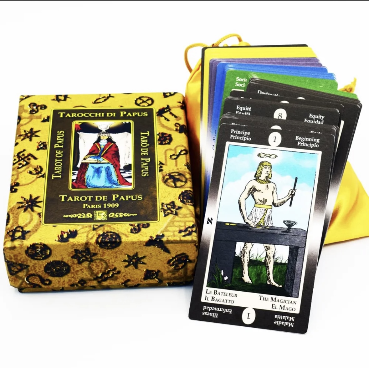 Es el Tarot cabalístico más importante del siglo XX. El ocultista francés Gérard “Papus” Encausse publicó en 1909 este ramo, combinando tradiciones cartománticas y misticismo esotérico. El Tarot de Papus vuelve a la luz después de 110 años en un aspecto suntuoso que realza su encanto cabalístico. MAGNÍFICA VERSIÓN EN COLOR de las 78 TARJETAS originalmente impresas en blanco y negro reimpresas bajo la dirección de Giordano Berti.