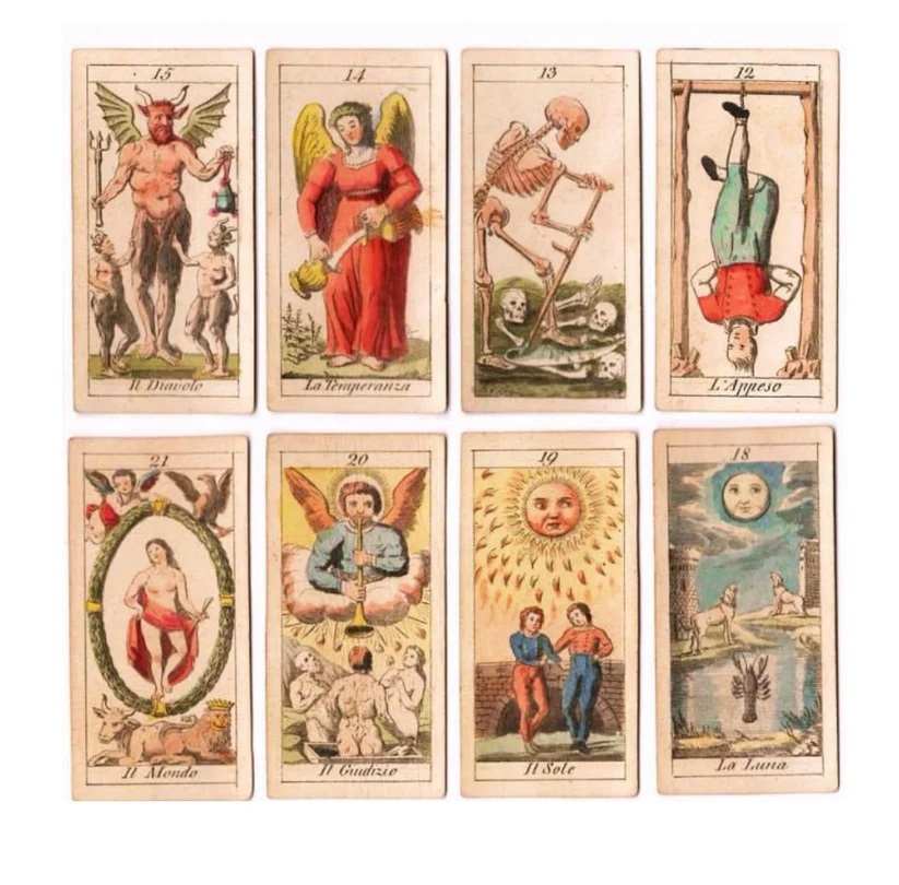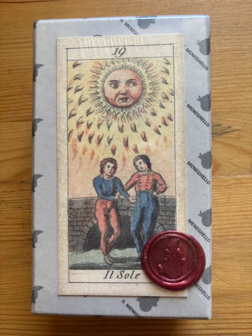 Il Meneghello nos trae este Tarot Napoleónico que es una rara baraja conmemorativa del Napoleónico de Italia (1805-1814), elaborada por Ferdinando Gumppenberg, de la que se conocen pocos ejemplares hasta la fecha. Se trata de una prueba de impresión que presenta el grabado completo, en el que aún no se ha inscrito la insignia del fabricante. La baraja está realizada mediante grabado sobre metal y pintada a mano.