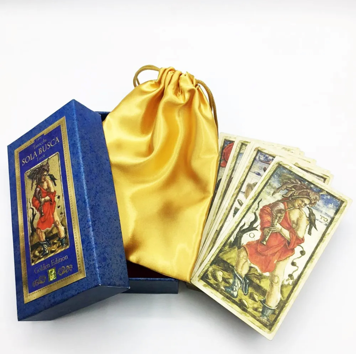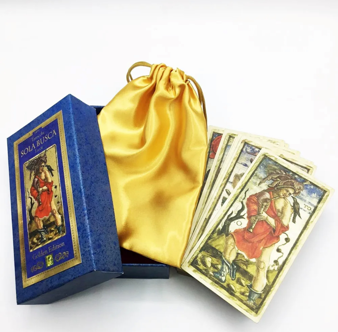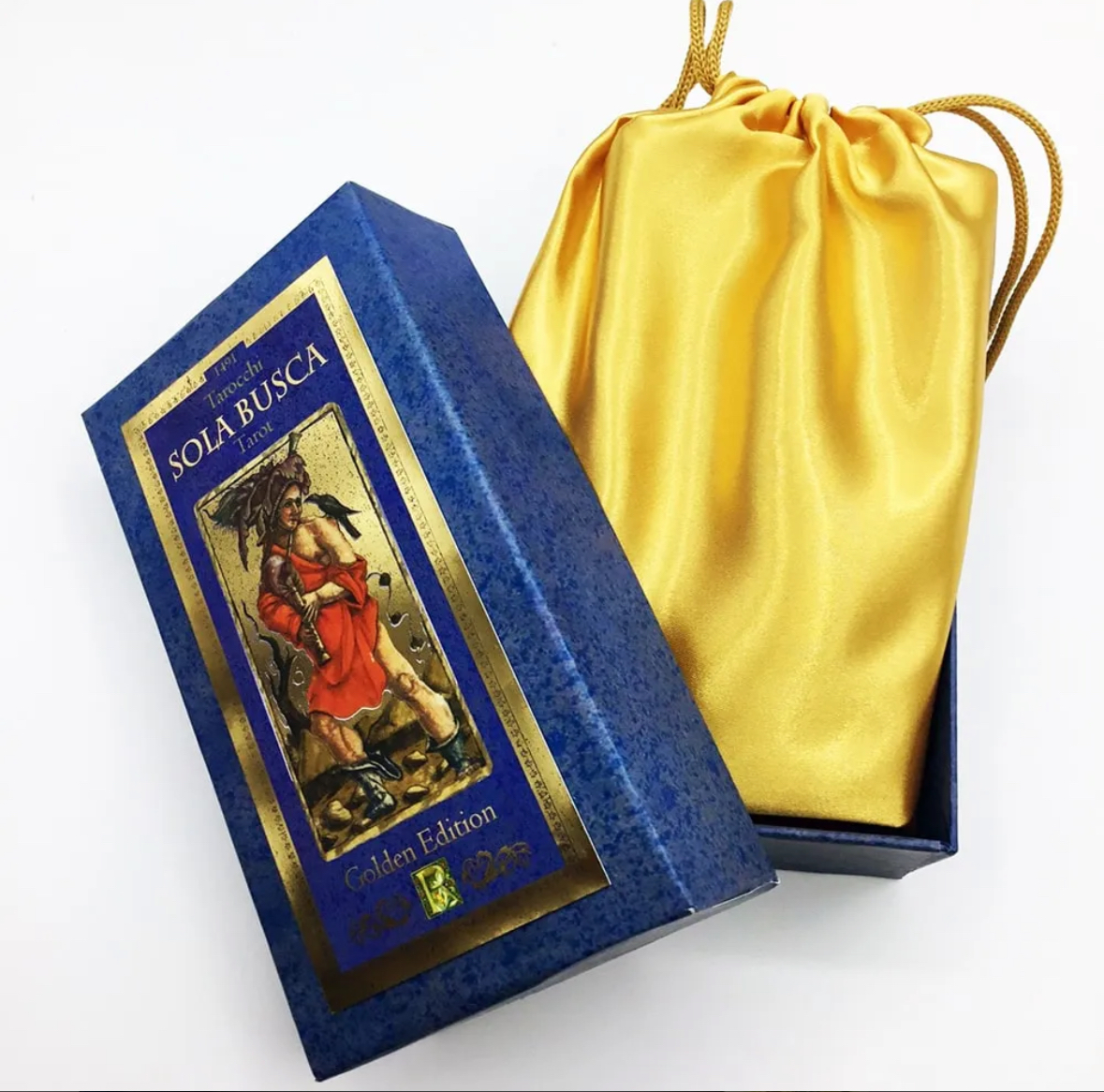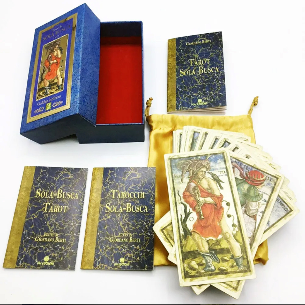 Desde hace 40 años Giordano Berti, conocido en todo el mundo como uno de los principales expertos en historia y esoterismo del Tarot, se ocupa de esta extraordinaria baraja creada en 1491, probablemente en Venecia. Esta obra consiste en la fiel reimpresión del Tarot Sola Busca. Las 78 HERMOSAS TARJETAS de gran tamaño (150 × 82 mm) se han reproducido en papel fino con alto contenido de algodón – ¡NO PLÁSTICO! – y se han ENRIQUECIDO CON UN DORADO en los bordes. Esta EDICIÓN está LIMITADA a solo 777 COPIAS numeradas y autografiadas por Giordano Berti en un CERTIFICADO DE GARANTÍA. La caja de estilo renacentista fue ideada por la diseñadora Letizia Rivetti y producida a mano por expertos artesanos italianos. Además de las 78 cartas en una bolsa de satén dorado, la caja contiene un LIBRETO escrito por el Curador, que cuenta los ORÍGENES de esta baraja, ofrece una síntesis de los significados de cada figura y explica un sencillo MÉTODO ADIVINATORIO. Una DEDICATORIA PERSONAL escrita a mano por Giordano Berti se añade a cada paquete. El mismo autor ha puesto a disposición un videocurso en línea dedicado al Tarot Sola Busca.