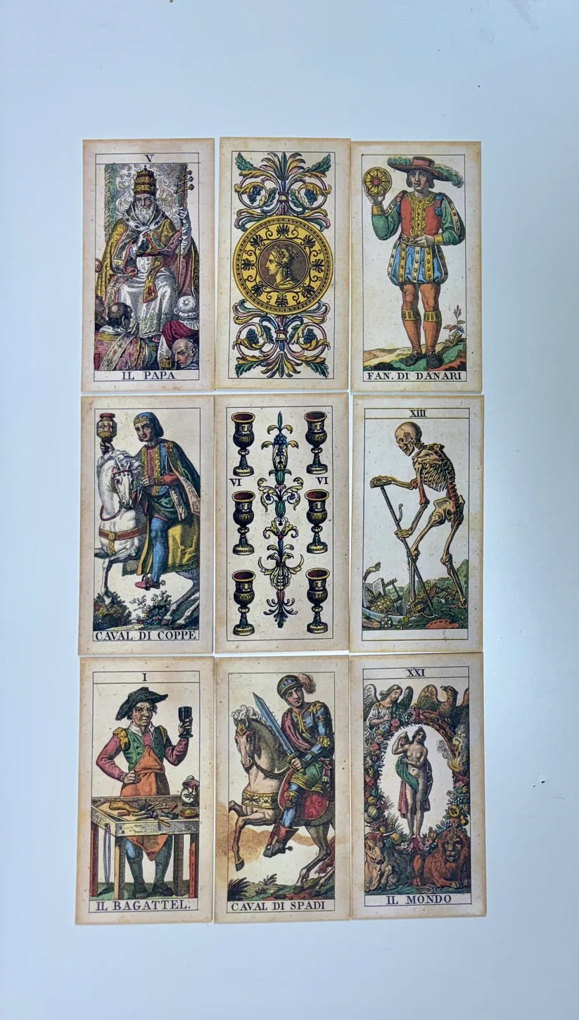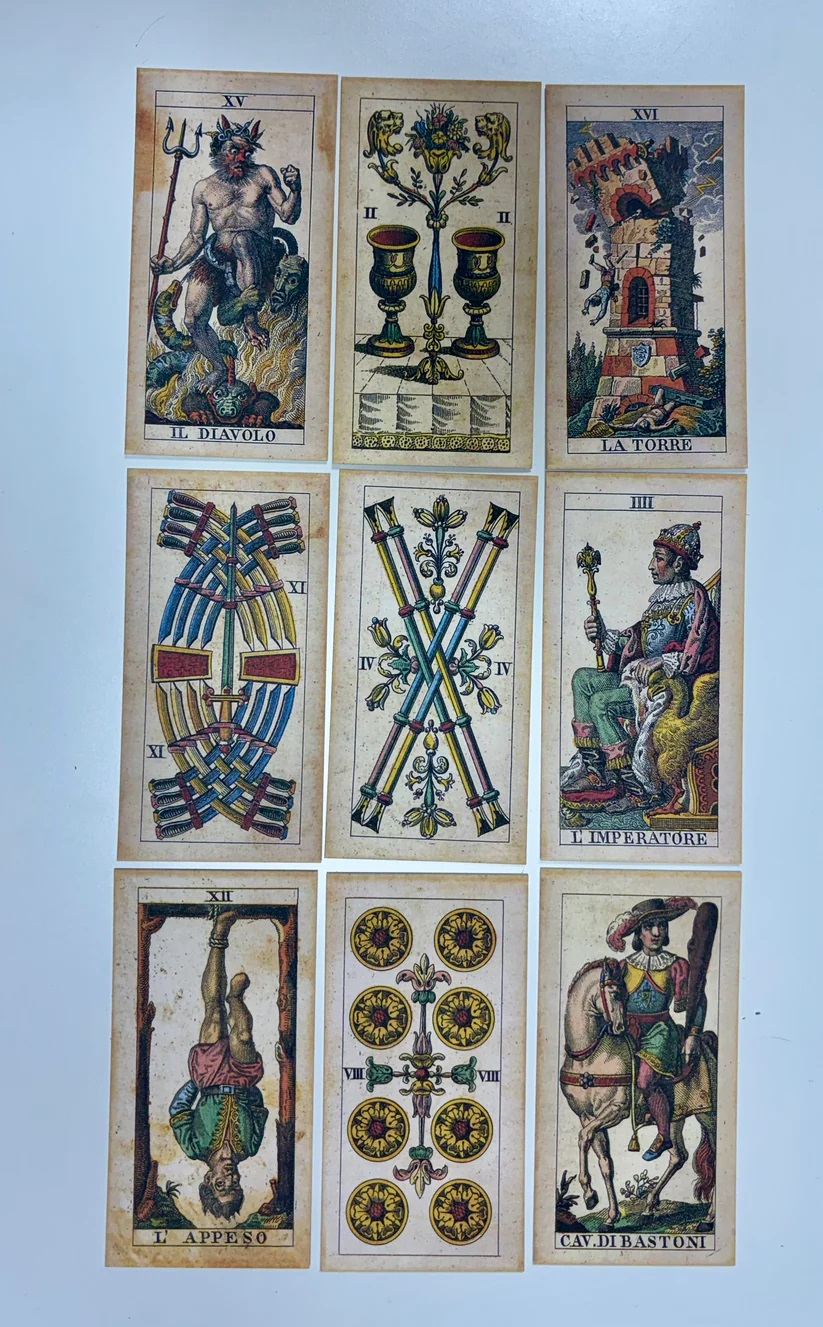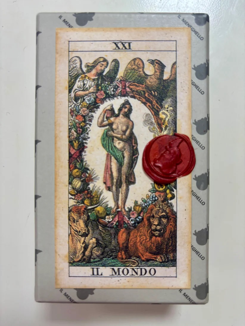 Tarot Soprafino de Il Meneghello. Este tarot tiene un nivel de detalle increíble. Te transportará directamente al año 1835 en cuanto lo saques de su caja. Creada por Carlo Dellaroc en Milán para el impresor Fernandino Gumppenberg.