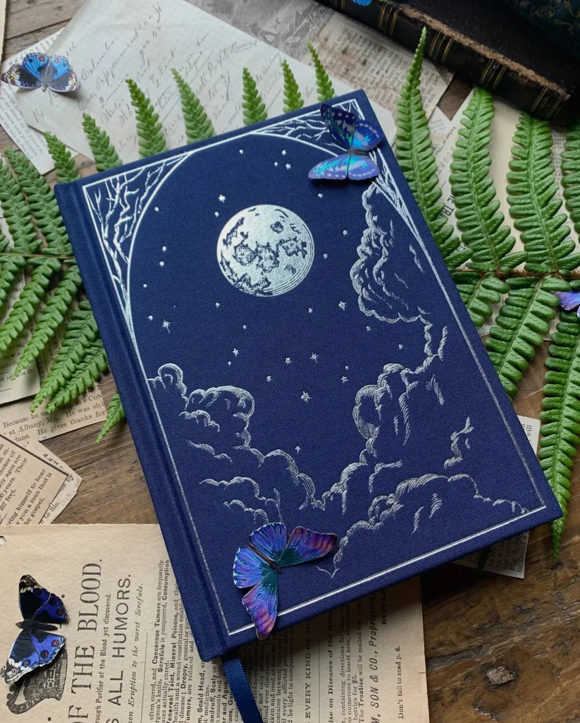 - Tapa dura de lino azul oscuro con estampado de aluminio en la tapa y el lomo. Elige entre oro o plata
