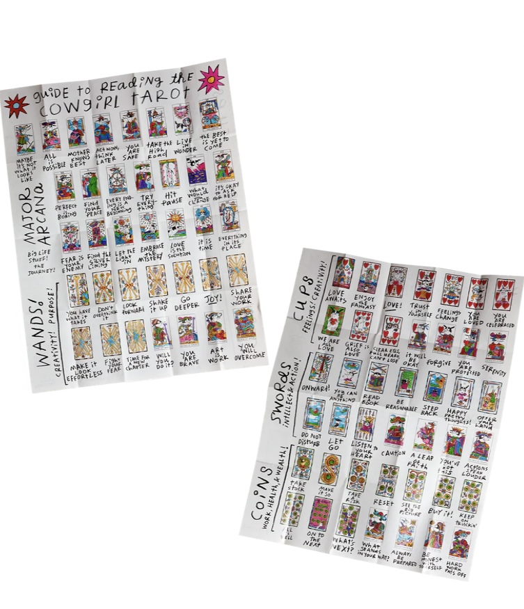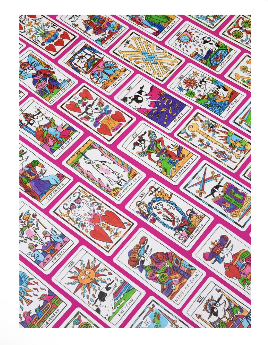 Estas tarjetas extra gruesas miden la tradicional 2,75' x 4,75' y se empaquetan en una caja de acabado mate con una guía plegable para el significado de cada tarjeta.