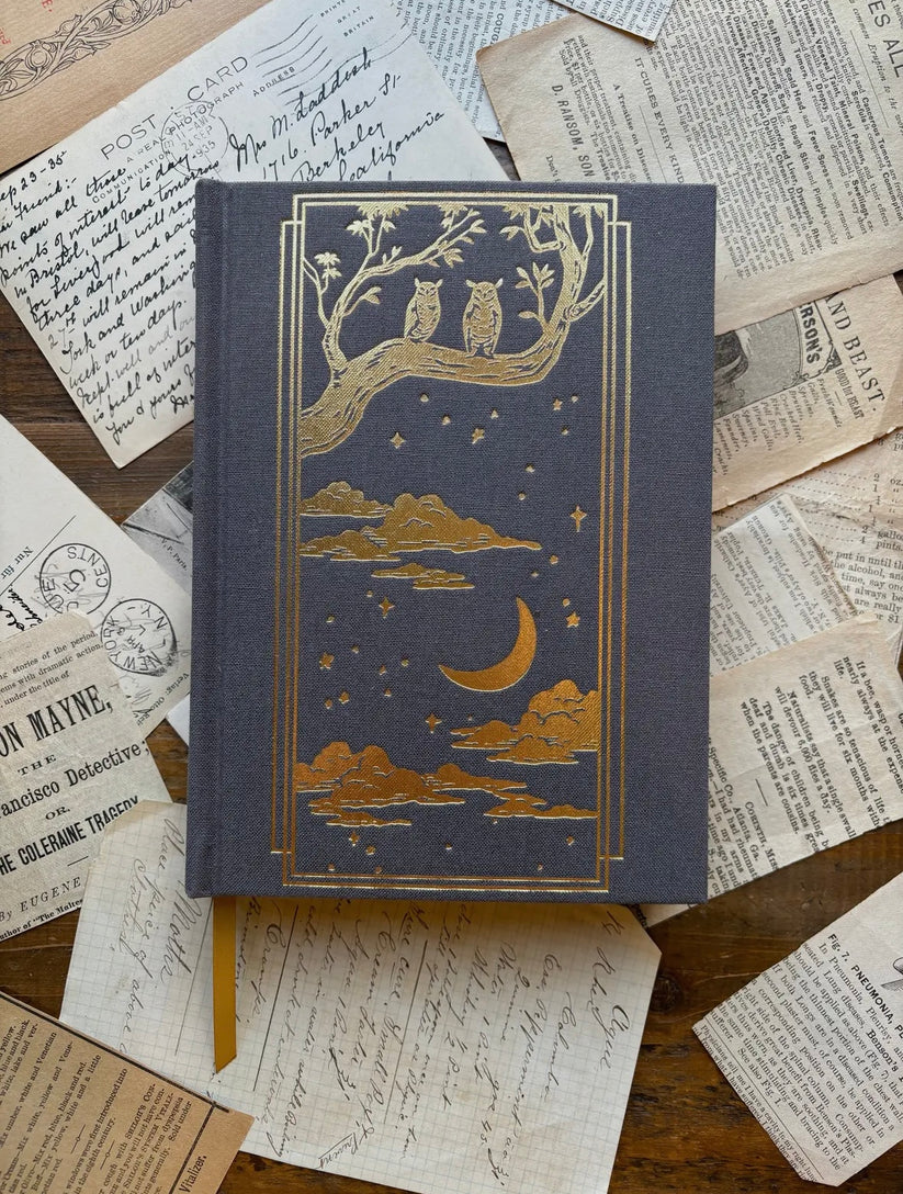 - Tapa dura de lino gris oscuro con estampado de lámina dorada en la tapa y el lomo